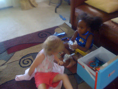 We had the pleasure of keeping Trey, Jonathan, and Princess, the 2 adopted and 1 foster child of our neighbor Nichole. Over the summer, single mom, Nichole has had her 2 adopted children and 3 other foster children. She is amazing to me! She sacrifices herself for the betterment of the children that God brings into her life. I am so blessed that God allows me to be part of these peoples lives. Here is a picture of Naomi playing with Princess. They were quick friends.